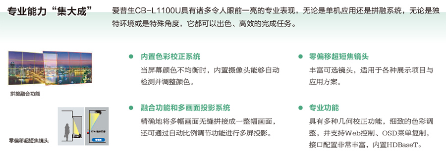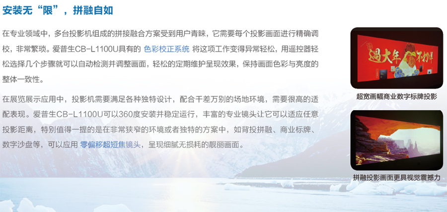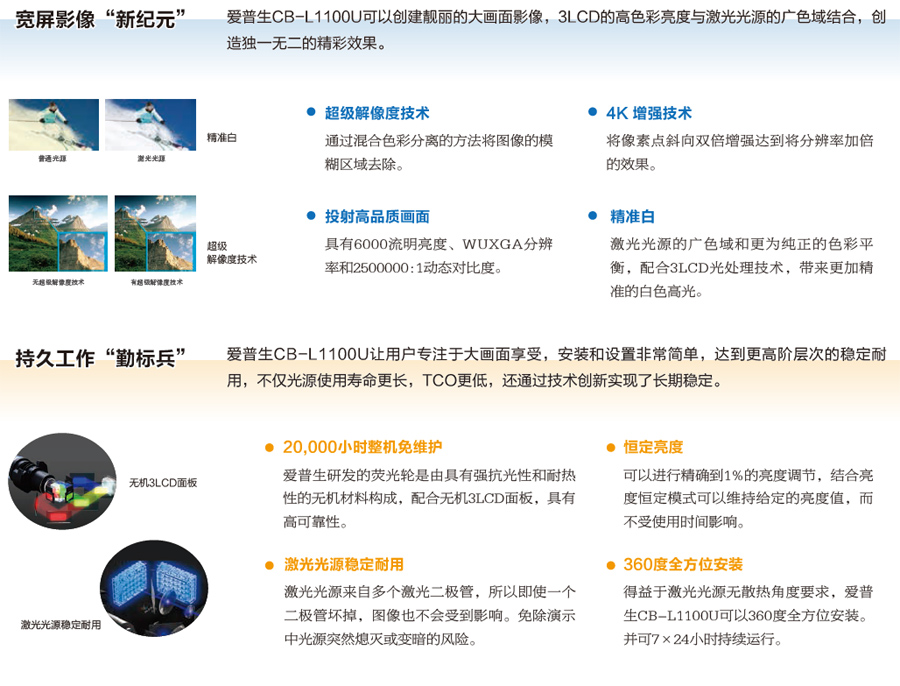激光光源技術是投影行業發展的重要趨勢之一,作為投影核心技術3LCD的創造者,愛普生工程新品體現3LCD的高影像品質及色彩再現性的優勢;采用密封的光路設計,防止灰塵進入,擁有長達20,000小時的使用壽命,并且鏡頭陣容更豐富,功能表現更強大,滿足行業用戶的多樣化需求。 |