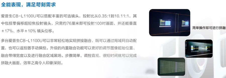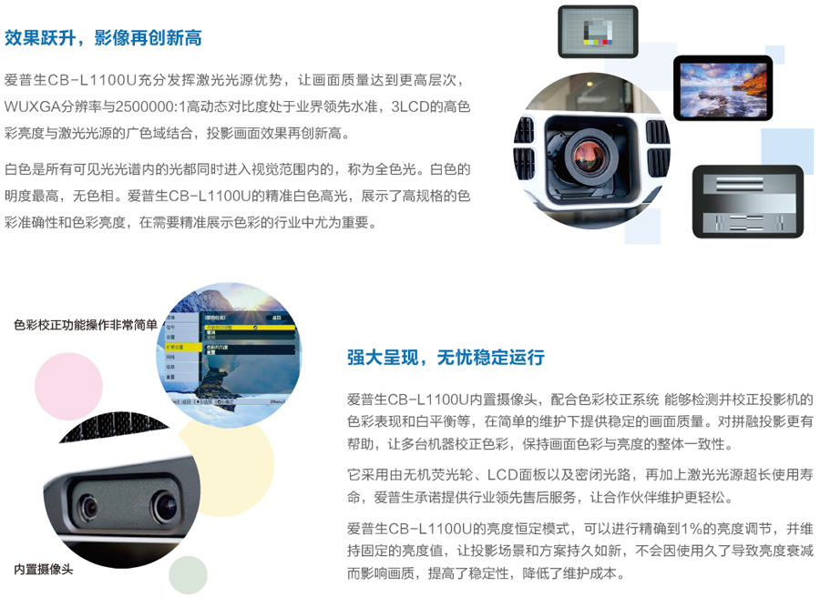 CB-L1100U是愛普生激光工程系列中的主流機型,亮度6000流明,WUXGA分辨率滿足高畫質需求,動態對比度2500000:1。激光光源提供更寬的色域、更純正的色彩平衡,加之4K增強技術以及自動色彩校正功能,可確保畫面效果始終卓越如初。360度安裝、零偏移短焦鏡頭等特性讓工程安裝更快捷簡單。 |