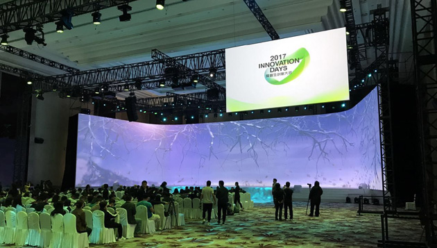 本次創新大會上最為吸引眼球的,莫過于大會開場時,由28臺愛普生激光工程投影機在44米異形大屏上打造的3D mapping