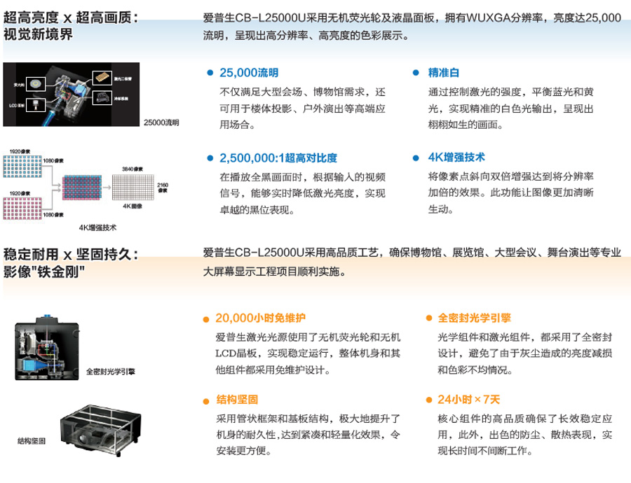 CB-L25000U是愛普生新推出的旗艦級激光光源高亮度工程投影機。亮度高達25,000流明,配合WUXGA分辨率和4K增強技術,可以滿足各類演出、大型會場等場所的使用需求。 |