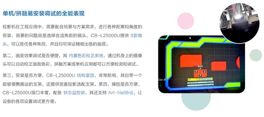 連續使用的場合。激光光源出色的散熱特性獲得了360度自由安裝能力,寬變焦范圍電動鏡頭帶有鏡頭記憶功能,提供出色工程適應性。內置色彩校正、邊緣融合、曲面校正系統為安裝使用帶來方便。內置對DMX-ArtNet協議的支持,滿足各類創意投影應用需求。 |