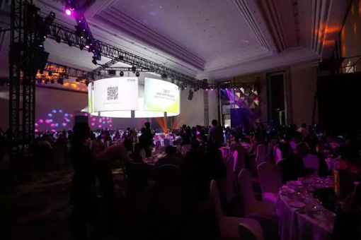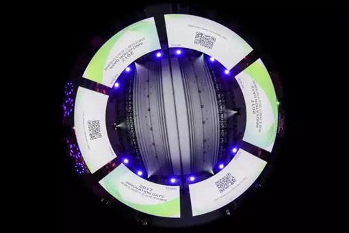 創(chuàng)新大會晚宴現(xiàn)場的這一雙面弧幕投影,就成為了當日的焦點之一。6片弧形長方形屏幕組成一個圓形“陣列”,屏幕內(nèi)外雙面均可看到投影內(nèi)容。該圓形“陣列”懸掛在圓形舞臺上方,大小、方位都非常適宜,既奪目別致,又不會擋住舞臺,是非常適合酒店宴會演出的設(shè)計。