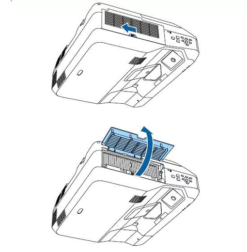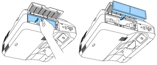 更換步驟與清潔步驟基本相同:取出損壞的空氣過濾器,將新的過濾器裝入投影機即可。