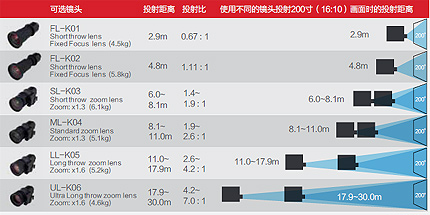 配備了從短焦到超長焦的6種鏡頭,可對應80-600英寸的幕布。僅需2.9米距離即可投射200英寸畫面,可根據大中型會議室、禮堂、宴會廳等適用場所來選擇適合的鏡頭。