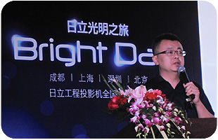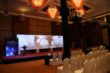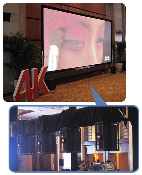 會場的主屏幕采用3臺 TCP-D13KU 工程投影機橫向拼接融合,結合分布式融合器處理完成。日立3片DLP工程投影機TCP-D13KU,擁有13000流明超高亮度,以及精致細膩的色彩表現,其拼接融合功能適用于有大畫面顯示需求的展覽展示行業。本系統利用投影機自帶的幾何校正及色彩調整功能,結合分布式融合器的融合帶生成、暗場補償等特點,可將超高清晰度的片源無縫呈現于大尺寸的屏幕上,畫面清晰銳利,融合帶過渡平滑,色彩豐富,展示效果極佳。