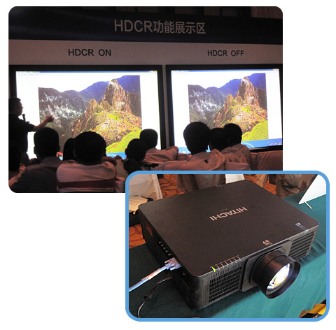 DLP工程機TCP-D1080W進行HDCR引擎的“開啟/關閉”對比展示。由日立研發的HDCR引擎,實現了強大的高動態對比功能。在明亮的環境中使用一般投影機,投影圖像中黑色部分受干擾,因而使得畫面變得模糊、色彩變得暗淡。開啟