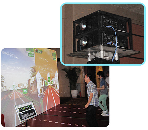 酷跑投影方案采用兩臺10000流明的日立單片工程投影機TCP-D1100X進行疊加,在展位上方以吊裝的方式投影出整個游戲的畫面,利用投影機畫面與地面噴繪的完美結合,使一個大家耳熟能詳的酷跑游戲,帶來一種全新方式的娛樂和體現,配合2.1立體聲道輸出,營造出極具科技感與身臨其境的震撼效果。此方案可應用于大小型活動以及展館的互動。 |