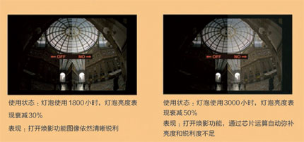 日立投影機獨創的圖像分明處理器(ACCENTUALIZER)芯片處理技術結合高動態對比度提升技術(HDCR),對圖像內暗場和細節進行自動調節,彌補因燈泡亮度衰減帶來的畫面清晰度不足,給用戶帶來持續地真實色彩體驗。