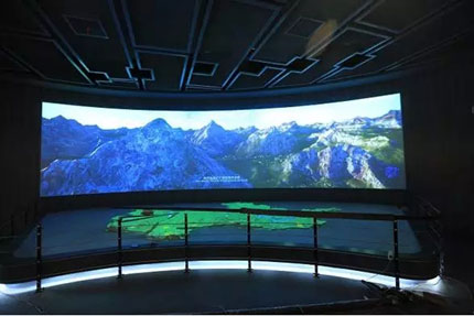 異形球幕區(qū),使用1臺(tái)日立TCP-D1080U工程投影機(jī)對(duì)半球狀造型進(jìn)行吊頂正投,利用專業(yè)軟件進(jìn)行曲面及異形校正,定制數(shù)字內(nèi)容,呈現(xiàn)郴州地貌風(fēng)景。