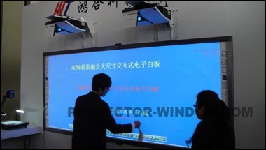 值得一提的是,鴻合雙A8投影機搭配16:9格式的122寸紅外框也在現場進行了展示。該產品核心采用“多功能紅外組合觸摸”技術,整體框架式設計,由密布在顯示區四周紅外接收和發射對管形成水平和垂直方向的掃描網格,形成一個掃描平面網,當有可以阻擋紅外光的物體阻擋住網格中的某對水平和垂直紅外掃描線時,就可以通過被阻擋的水平和垂直方向的紅外線位置確定X,Y坐標。其精準的定位和超快的反應速度為用戶帶來高效的教學體驗。在設計工藝上,該產品應用器件通用技術,其內部的PCB板可通用、獨特的防塵結構保證了產品的穩定性、無線接口的設計選擇可讓用戶靈活切換主電腦,所有設計充分體現出“節能環保”和“人性化設計”的特點,進一步彰顯鴻合科技自有品牌的研發活力和制造實力。