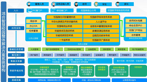 在教育領(lǐng)域已擁有相當(dāng)口碑與市場的鴻合科技,其智慧校園內(nèi)涵就非常豐富,由12部分組成的系統(tǒng)架構(gòu)足以支撐起教學(xué)工作的方方面面。如校園身份識別管理系統(tǒng)、校園數(shù)字媒體發(fā)布系統(tǒng)、常態(tài)化錄播及開放課堂系統(tǒng)、設(shè)備集中管理控制系統(tǒng)、校園電視臺系統(tǒng)、教育資源應(yīng)用系統(tǒng)、智能排課及選課系統(tǒng)、遠(yuǎn)程互動教學(xué)系統(tǒng)、教學(xué)評價系統(tǒng)、組卷及閱卷系統(tǒng)、智能視頻安防系統(tǒng)、校園數(shù)字廣播系統(tǒng)。