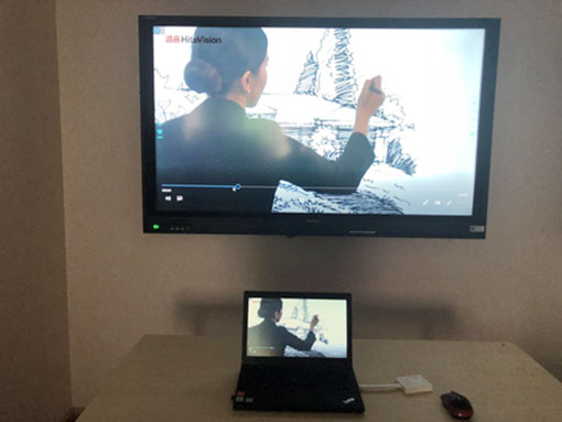 在評測中筆者通過手機自帶的“屏幕鏡像”功能(iOS系統)與N系列大屏連接,將手機顯示的內容投影到N系列的屏幕上,這就是N系列的“無線傳屏”功能。在電腦投屏方面,其也實現了優化升級。摒棄了原本繁瑣的數據連接線,僅需一個小小的無線投屏接收器便可實現電腦和大屏連接,將內容投射在大屏上。