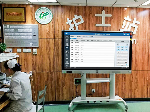 在護士站,鴻合V650運行數字化病房管理系統,為住院患者、護士、醫生提供無紙化作業、實時病人資訊、通報床位動態訊息展示,鴻合V650操控簡單,方便隨時查閱,協助醫療護理工作高效完成。