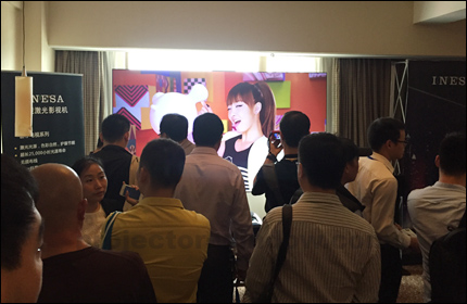 針對客廳,系統由INESA智能激光電視、100寸無源光學增強屏組成,因為采用了激光光源,畫面具有寬廣的色域,配合100寸大屏給人帶來震撼的視聽感受。此外,反射式的短焦投射畫面方式,使機器能夠隱藏于機柜中,不僅美觀又節省空間,F場觀眾正通過互動進行游戲體驗,感受大屏帶來的極致享受。
