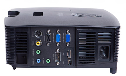 IN227ST投影機側面接口區域,不僅提供HDMI接口、雙VGA、S-Video和復合視頻端子等視頻輸出接口支持,還提供3.5mm音頻輸入輸出和Mini