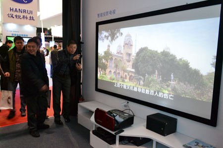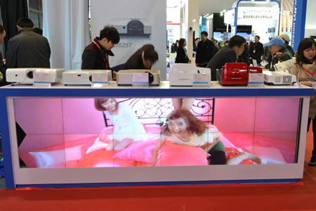 艾洛維此次展會的拳頭產品“零距離投影電視”在現場引起了轟動。該款產品可以直接在電視柜上投射100寸的超大畫面,無需安裝。利用普通白色墻壁就可以在家居環(huán)境體驗影院般的視覺享受。此外,該產品支持機頂盒連接,支持1080P高清影像,支持外接移動硬盤或U盤,內置Android系統(tǒng),并且該系統(tǒng)能夠隨時升級,滿足用戶的不同需求。