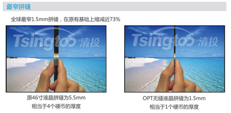 清投產(chǎn)品部工作人員經(jīng)過實(shí)際拼縫比對(duì),傳統(tǒng)液晶5.5mm的拼縫相當(dāng)于4個(gè)一元硬幣的厚度,而無縫液晶的厚度卻只相當(dāng)于1枚一元硬幣的厚度大小,在原有拼縫的基礎(chǔ)上縮小了將近73%,革命性地降低了拼縫的黑邊寬度,無論是在視覺上還是在實(shí)際顯示上,都提升了很大一個(gè)臺(tái)階,創(chuàng)下了全球最窄邊液晶拼接的記錄。
