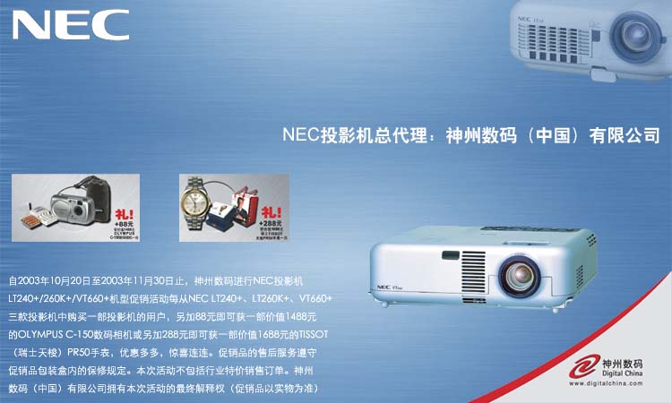 就在神州數碼與NEC聯合舉行規模盛大的新聞發布會,并簽署戰略合作協議的同時,雙方為了答謝廣大用戶的支持,特舉辦“神州數碼優惠大行動”促銷活動。據悉,自2003年10月20日起至2003年11月30日止,凡是購買NEC LT240+、LT260+、VT660+三款投影機中任意一部的用戶,另加88元即可獲贈一部價值1488元的OLYMPUS C-150數碼相機,如果另加288元更可獲贈一部價值1688元TISSOT(瑞士天梭)PR50手表。