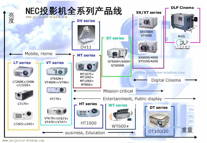 NEC公司長期致力于顯示產品的設計、開發和制造,并已經有超過23年的歷史。多年來,NEC始終堅持以用戶為中心的原則,開發出LT、VT、MT、GT、SX/XT、DT、HT和WT八大系列投影機和DV系列數字展示臺,適合不同環境和行業領域使用,為不同用戶提供豐富的選擇。
