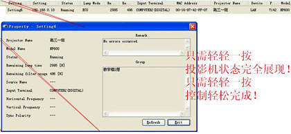 4.0軟件為主的中控解決方案,用戶即可隨意查看網(wǎng)絡(luò)上任意一臺(tái)投影機(jī)的使用時(shí)間、信號(hào)來源、是否正常運(yùn)行等狀況信息。此外,依仗PC Control