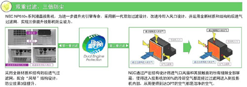 眾所周知,防塵是投影機最關鍵的性能指標之一,特別是針對中國的教育行業現狀,投影機的防塵功能更是行業用戶最為看重的。對此,各廠商在防塵設計上都下大功夫,力求在防塵上達到最佳效果。迄今為至,NEC投影機已創造了多項投影機專利技術,如沖突風冷技術,泵式冷卻系統,超高亮度光學設計技術,及高畫質圖像處理轉換功能IP