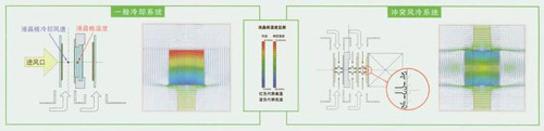新型的液晶板冷卻系統為兩側同時進風,兩道風在液晶板中部位置相遇互推,由此產生螺旋狀氣流,可以均勻地對液晶板進行散熱,這一系統能夠使液晶板和偏光版壽命倍增。其效果可以看所示的實時液晶板溫度監測。可以明顯觀測到接近出風口的一端的液晶板的溫度得到了有效地控制,進風口和出風口的溫度相近,遠遠低于一般冷卻系統。