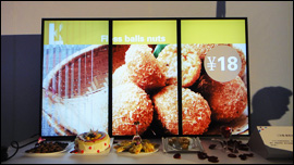 展會現場,最抓人眼球的莫過于LED背光多角度安放展區,使用4臺X461S超薄顯示器2×2拼接吸頂展示。X461S數字標牌采用了LED背光技術,體型纖薄時尚,厚度薄至43mm,僅重18.9kg,即便吸頂安裝仍可以呈現完美畫面,在業內獨樹一幟。能夠勝任最為苛刻的吸頂安裝, NEC顯示器無論在外觀的輕薄性還是材質的堅固性上都更勝一籌, 保證360度安裝條件下穩定如一的顯示優質畫面,真正做到令用戶安心。