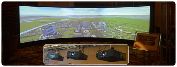 數字城市是虛擬現實項目中常見形式,通過多通道三維場景建設,輔以外設操作場景變化,達到虛擬場景漫游的目的。本方案為高清場景三通道弧幕融合展示,通過外設實現漫游,NEC