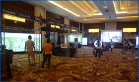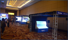該方案采用了NEC獨有的OPS(嵌入式PC)和獨特疊加構造實現簡單便捷被動立體方案,信號源采用內部OPS信號接口及OPS的DP環出信號接口實現左右眼2路不同畫面的播放,信號傳輸距離極短,系統穩定性高,適用于虛擬仿真、立體展示的行業應用。