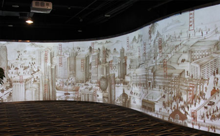 百年大連展區(qū)揭示了大連近百年來的歷史足跡,并展望了鉆石灣高端商務(wù)、住宅區(qū)未來的發(fā)展空間,由NP4100+投影機(jī)拼接融成的巨幅流動(dòng)畫卷讓人眼前一亮,近似《清明上河圖》的繪制風(fēng)格頗具新意,而成環(huán)形曲面展示的畫卷也盡顯NEC出眾的投影機(jī)產(chǎn)品、技術(shù),據(jù)現(xiàn)場講解人員介紹,單是NP4100+投影機(jī)就配備了5款不同焦距鏡頭,可以實(shí)現(xiàn)2.7-17.1m內(nèi)的任意距離投影。