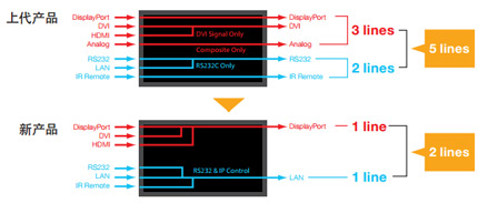NEC特有的菊花鏈設計,有效減少了信號在傳輸過程中的衰減。視頻信號可通過一根DisplayPort環出;控制信號(RS232\LAN\IR