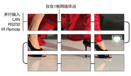 三合一控制菊花鏈設計最大可支持100臺(10×10)顯示器的拼接,控制信號通過一根網線環出,既減少連接線纜也降低了人力成本。獨有的幀同步功能保證拼接墻畫面在高速運動時,拼接單元之間畫面的同步性。