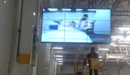 近日,某中央直屬國有特大型汽車生產企業的發動機生產車間添了一位“新成員”,它就是一組吊裝在橫梁上的46寸NEC超窄邊“勻拼”系列顯示器組合而成的3×3液晶拼接屏,用以播放企業宣傳片及重要通知,也是同輝佳視液晶拼接顯示方案的又一成功項目。