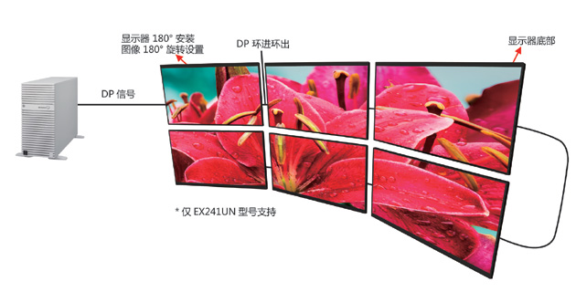Matrix自拼接功能,在無需外設的情況下可輕松實現5*5的拼接方案。此拼接方案不似以往的普通拼接,由NEC自拼接功能加之圖像180度翻轉和顯示器180度安裝、DP視頻信號環出來實現。