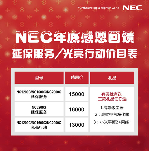 此次NEC年底感恩大促,NEC針對(duì)2K機(jī)型繼續(xù)推出延保服務(wù)、“光亮行動(dòng)”的活動(dòng)。延保服務(wù)——延長(zhǎng)保修,小投入大保障,保證放映無(wú)憂;光亮行動(dòng)——從本質(zhì)上提升放映機(jī)亮度,實(shí)現(xiàn)核心光學(xué)元器件的深度清潔,專注光芯級(jí)別的精密清洗和調(diào)整,是唯獨(dú)廠家才能做到的光芯級(jí)別的深度除塵服務(wù)。只要購(gòu)買延保服務(wù)和“光亮行動(dòng)”的任意一款,就有超值大禮送上!