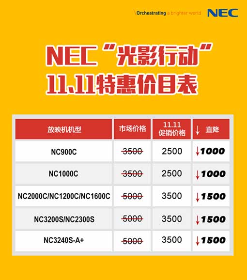 首批購買單色激光放映機的小伙伴們,小N喊你來購買延保啦,為您的放映機增加一道保護傘,保障它正常運行,解除您的所有顧慮。真正的福利是讓您享受高品質的同時,還能享受最優惠的價格!此次雙11期間,NEC單色激光放映機迎來了首次延保促銷,折扣低至85折,最高直降2001元!