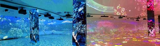 沉浸式空間給人帶來的是全方位、立體式的逼真感受,隨著畫面的變化,游客似乎能嗅到山水中濕潤的空氣,聽到林間的鳥鳴蟲語。這些效果離不開NEC獨創(chuàng)的智能融合功能,能夠支持多臺投影機實現(xiàn)拼接融合。結(jié)合NEC幾何校正軟件,可以在無任何外置硬件的情況下,對投射的巨大畫面圖像調(diào)整。同時,NEC工程投影機可實現(xiàn)360
