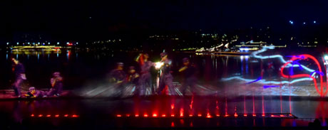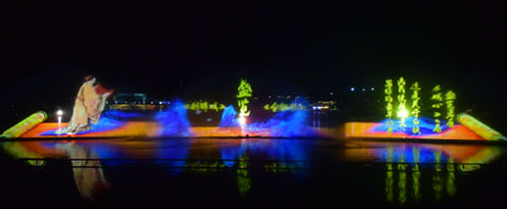 清晰絢麗的巨幅水幕投影畫面與白鷺湖漂亮的夜景燈光以及表演激光交相輝映,搭配動感噴泉、火焰噴射、強勁音樂、香氛特效等演繹形式,營造的5D現場效果澎湃激昂、令人目不暇接,為觀眾帶來全維度沉浸享受。 |