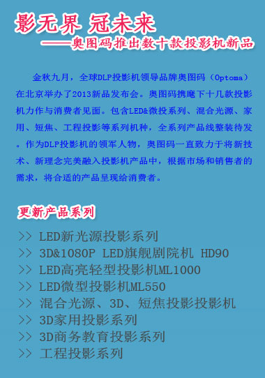本次新推出的十幾款產品有不少的新技術、新應用讓用戶眼前一亮,通過本次發布會之后,奧圖碼的產品線涵蓋了會議/教育、娛樂、高畫質家庭影院型等幾大類,涵蓋了商務、教育、政府、娛樂、家用等各個領域,致力于使