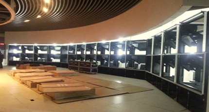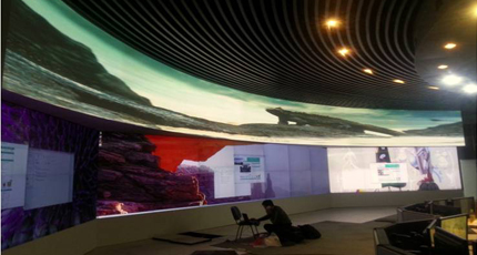 流明的奧圖碼工程投影機,再通過工程級融合器,將7臺投影機連貫成一個18米×1.8米、分辨率高達12000×1200的完整凹形畫面。