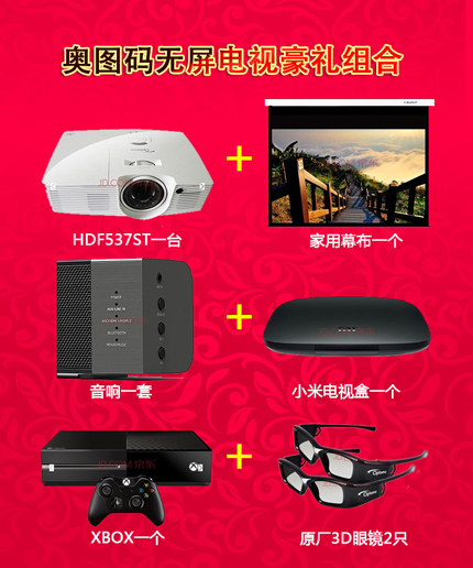 1080P家用短焦投影機(jī)HDF537ST一臺、家用幕布一個(gè)、音響一套、小米電視盒一個(gè)、XBOX一個(gè)、原廠3D眼鏡2只。心動不如行動,趕快拿起手機(jī),刷單哦!