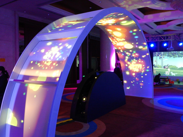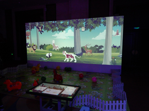 其中神筆酷甩案例,此方案采用兩臺6000流明WXGA(1280x800)工程投影機W515T,搭配GB-200數字高清融合器進行畫面融合,有效投影畫面為2.5x6m,配合一套由多臺多點觸摸桌與一組大型顯示墻組成的多媒體兒童互動系統。兒童可以在觸摸桌上涂鴉,繪制好的動物可以被直接甩到大型顯示墻上在場景中即刻"變活"。系統利用現代化的高科技手段,寓教于樂,加強對兒童的益智教育,打破傳統兒童娛樂模式的束縛,充分開發兒童的創造力和動手能力。