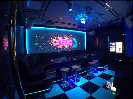 項目描述: KTV的多間包房采用了奧圖碼OEV953UT激光超短焦投影機,五個包房每個房間用兩臺投影機和融合器GB-200做畫面融合。激光光源超長壽命無需更換投影機燈泡,超短焦距讓投射光線不會打到人體上。包房可根據需要,任意更換場景主題。