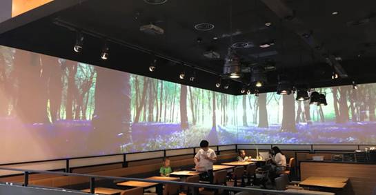 餐廳投影的圖像包括有螢火蟲一般的亮點飛舞的森林;微風吹拂陽光傾瀉的草原;一望無際清風拂面的薰衣草園;落櫻散華美不勝收的櫻樹林;幽藍靜謐魚兒游動的深海底。