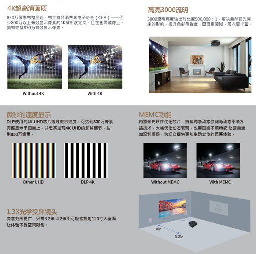 奧圖碼UHD588超高清家用投影機(jī)擁有3000流明的亮度和500,000:1對比度,為用戶帶來震撼新視界,其還融合純凈動(dòng)態(tài)偵測與動(dòng)態(tài)平順補(bǔ)插技術(shù)、Bluray-1080P