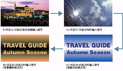 該功能能使一些顯示操作可以簡(jiǎn)單地自動(dòng)執(zhí)行,無(wú)需額外的日程設(shè)定程序。可以設(shè)置多種操作——開機(jī)/關(guān)機(jī)。圖像信號(hào)選擇,屏幕保護(hù)程序等,并在一周內(nèi)指定日期的指定時(shí)間執(zhí)行。