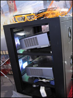 此應(yīng)用方案采用的是兩臺松下投影機,利用雙機投影式的方法,形成立體3D效果。雙投影機式是通過雙頭輸出的顯卡將播放內(nèi)容同步直接輸出到兩個投影機中,在投射左眼的投影機前加上偏正鏡,然后在投射右眼圖像的投影機前也加偏正鏡但角度旋轉(zhuǎn)