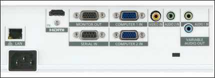 配備了1個HDMI輸入端口,2個電腦輸入端口(RGB),有線局域網以及1個外部控制用串口(RS232C)等豐富的端口。支持廣泛的系統應用,便于投影機的攜帶或吊裝使用。