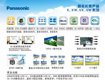 松下商教投影機之所以受到市場熱捧,到底好在哪里?通過隨訪永輝集團的使用者我們找到了答案。這與突出的產品性能、完善的售后服務網絡體系和力爭在第一時間解決用戶困難的服務態度是密不可分的。松下2014年推出的新品PT-X361C系列和PT-UX363C系列在產品性能方面,第一,防塵,密閉機殼結構設計搭載大面積風琴褶皺空氣過濾網擁有最長可達5000小時的更換周期,比以往產品節約使用成本50%。第二,高亮、高對比度,白天的會議室通常較明亮,投影畫面發白、不清晰,帶有強光感應技術(DLV)及10000:1的高對比度的松下商教投影機新品,使畫面整體的感官亮度、銳度及對比度均得到大幅度提升,真實還原投影畫面。第三,燈泡持久耐用,采用松下UHM冷光源燈泡,使用壽命最高達8000小時。第四,人性化設計,支持1.2倍光學變焦、±30度垂直/±15度水平梯形校正及曲面校正功能,即使不是投影在投影幕上,畫面仍可完美呈現。第五,配備多臺投影機監控軟件,由于永輝集團安裝了多臺投影機,有了這個免費軟件,管理者可以通過有線網絡監控多達2048臺投影機的運行過程,大大提高工作效率。有了如此全面的出色表現,我們更有理由相信,松下商教投影機是性價比極高的明星產品。