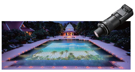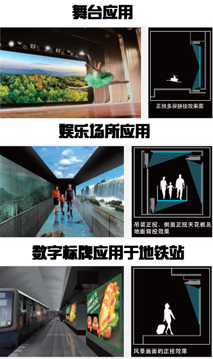 即使在屏幕前方沒有足夠的正投空間,也可輕松實現大畫面投影成像。由于可以使用20000流明的三芯片DLP投影機,因此實現了在明亮環境下安裝使用的需求。 |